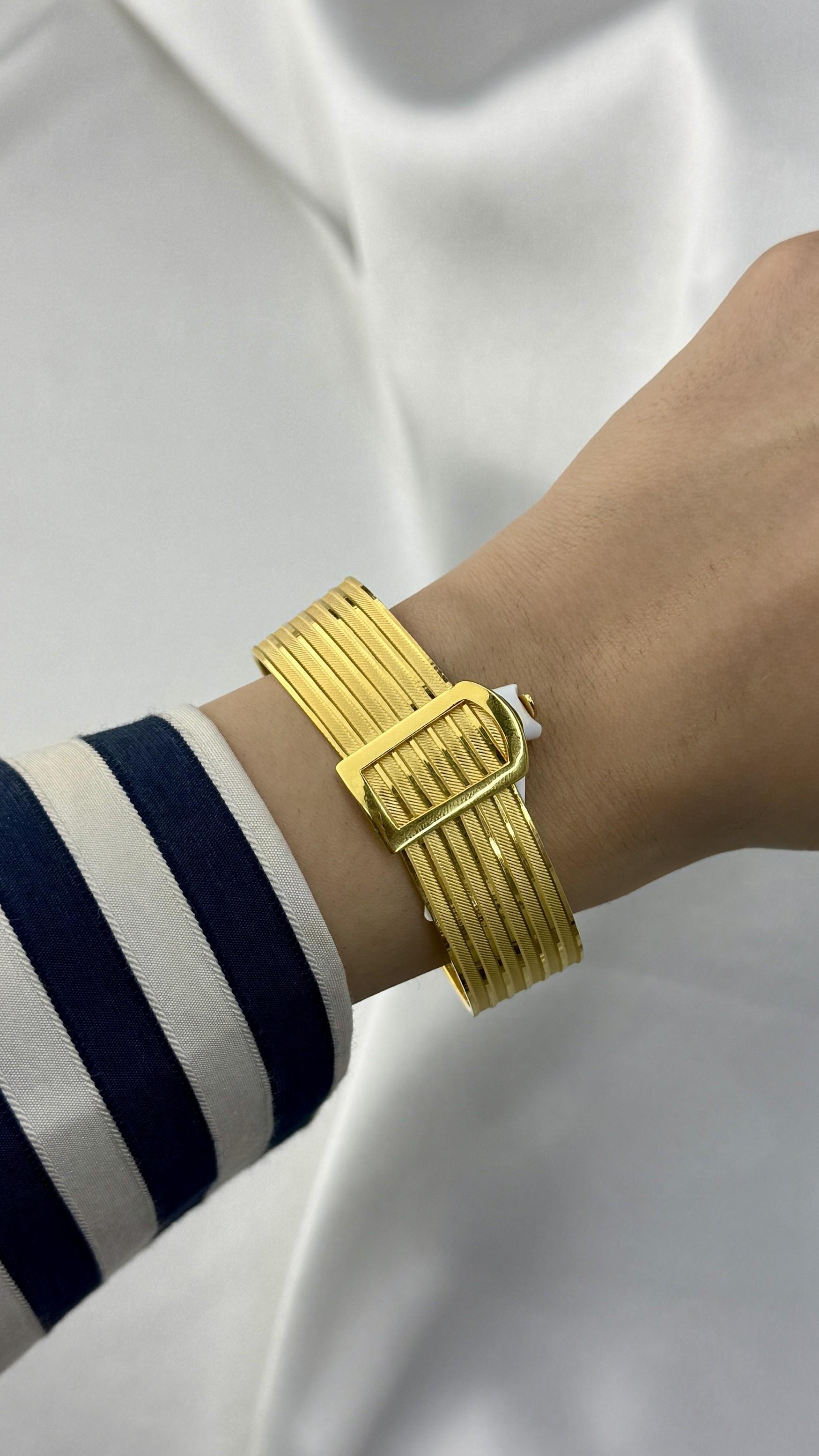 Geleneksel zarafet modern tasarımla buluşuyor! 8 ayar altından üretilen, 16,5 gram ağırlığındaki bu hasır kelepçe bilezik; özenle işlenmiş dokusu ve parlaklığıyla bileğinizde fark yaratır.