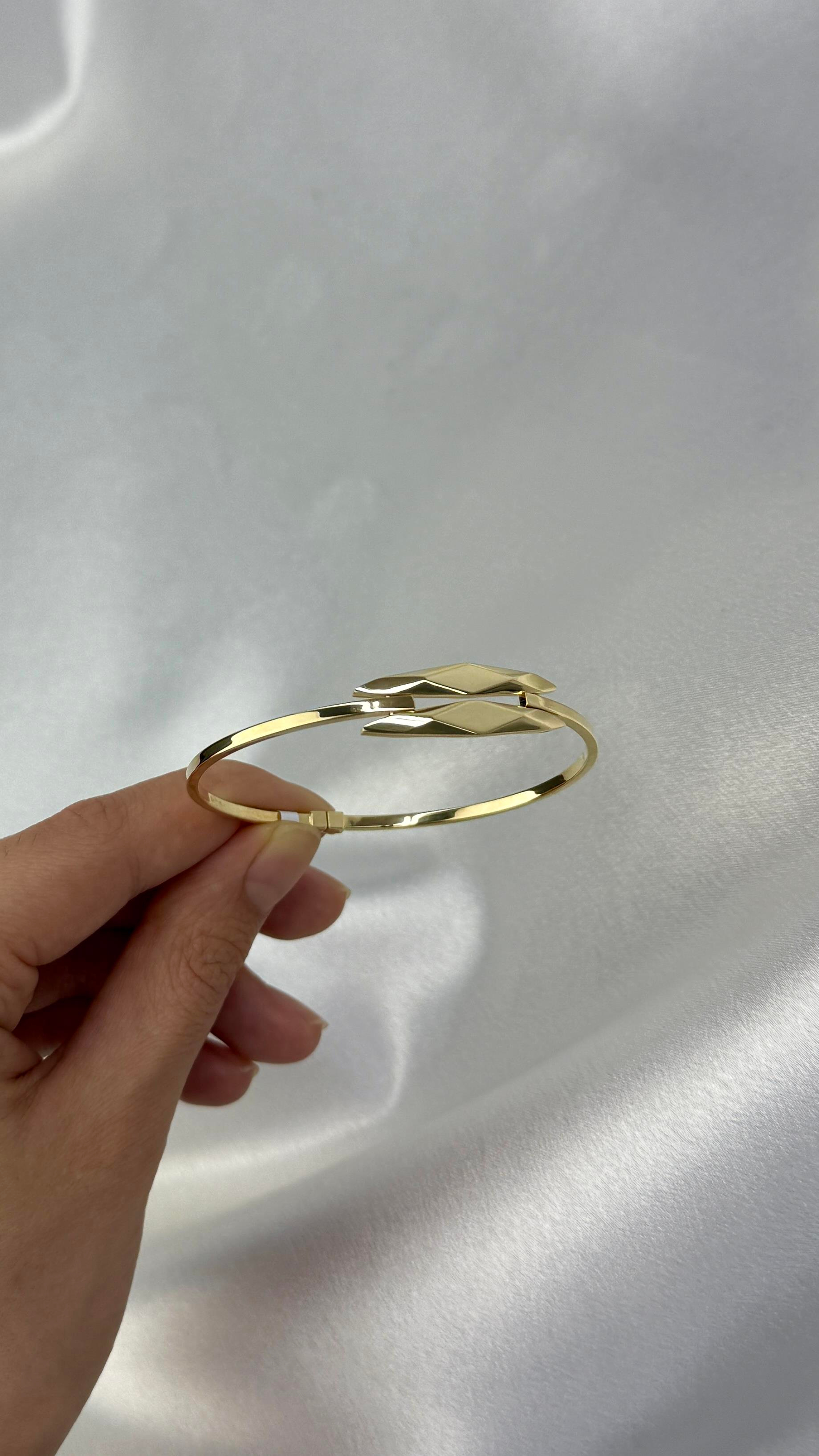 Geometrik figürlerle tasarlanmış çift sıralı formu sayesinde bu özel kelepçe bilezik, bileğinizde hem minimal hem de dikkat çekici bir duruş sergiler. 8 ayar altının hafifliği ve sağlamlığıyla gün boyu konforlu kullanım sunarken, modern stilinize sofistike bir dokunuş katar.