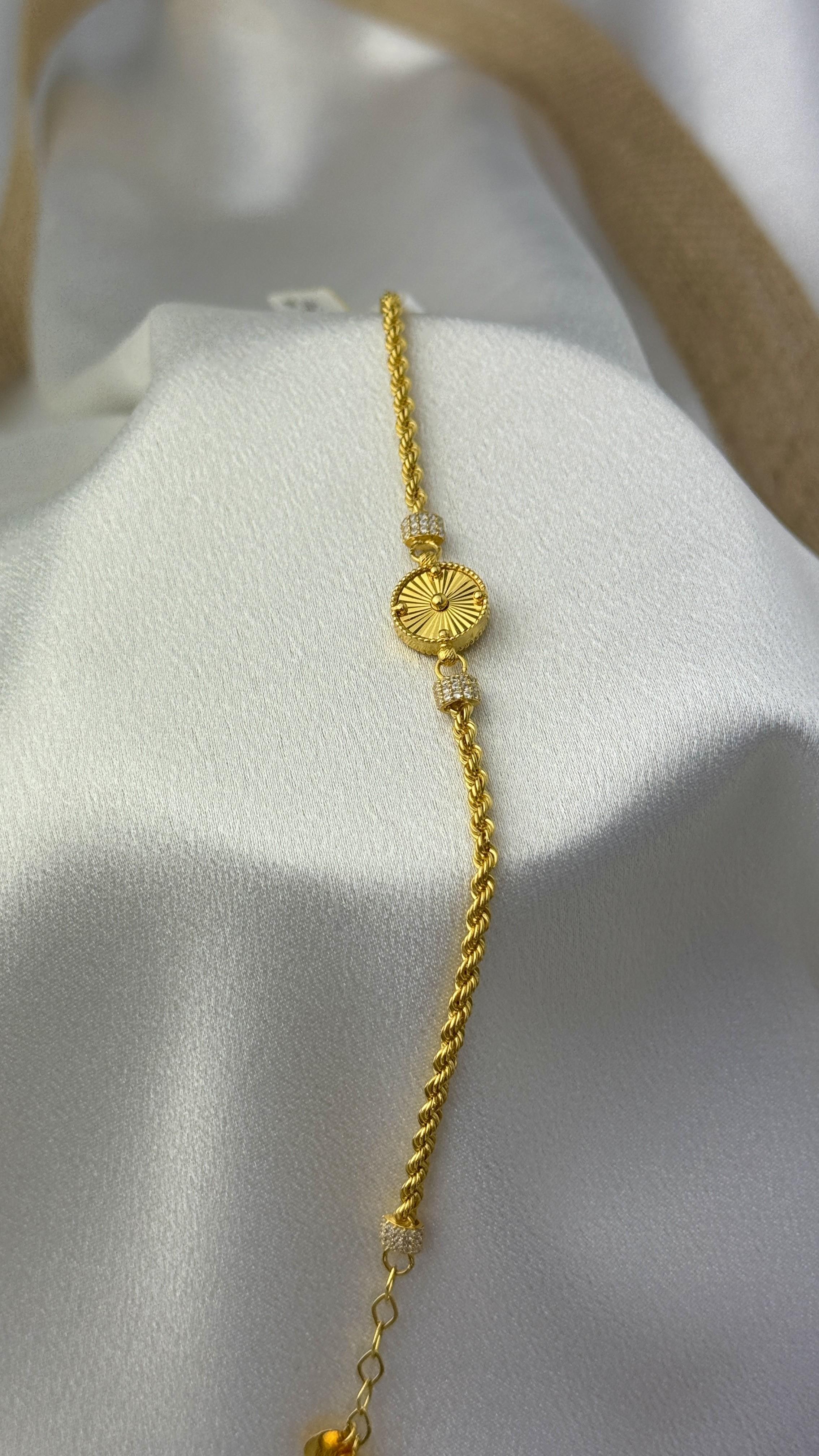 4,70 gram ağırlığındaki bu özel bileklik, 8 ayar altının sıcak ışıltısıyla işlenmiş ve parıltılı zirkon taşlarla süslenmiştir. Şık figür detayları, tasarıma zarif bir anlam katarken; taşların gösterişli ışıltısı her bakışta dikkat çeker.