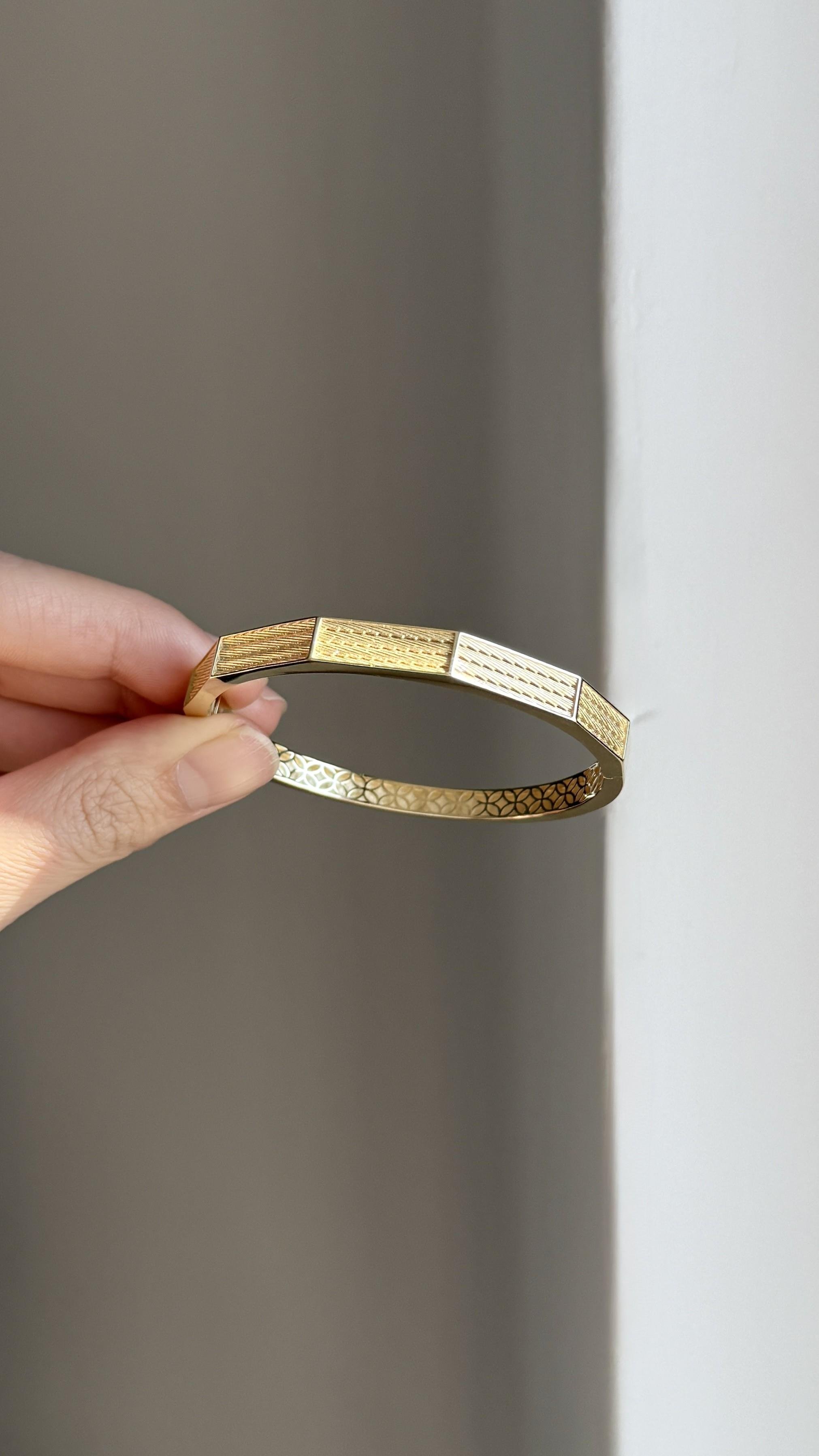 Güçlü ve sofistike duruşuyla dikkat çeken kalın çizgili altın kelepçe bilezik, klasik ve modern tasarımı bir araya getiriyor. 13,2 gram ağırlığında ve 14 ayar altından üretilen bu özel bilezik, 5,8 cm çapındaki ölçüsüyle bileğinizde gösterişli bir duruş sergiler. Kalın çizgili tasarımı, bileziğe derinlik ve ışıltı katarken, kelepçe modeli sayesinde kolay takılıp çıkarılabilir. Göz alıcı detaylarıyla özel günlerde ve günlük kullanımda stilinizi tamamlayacak şık bir aksesuardır.