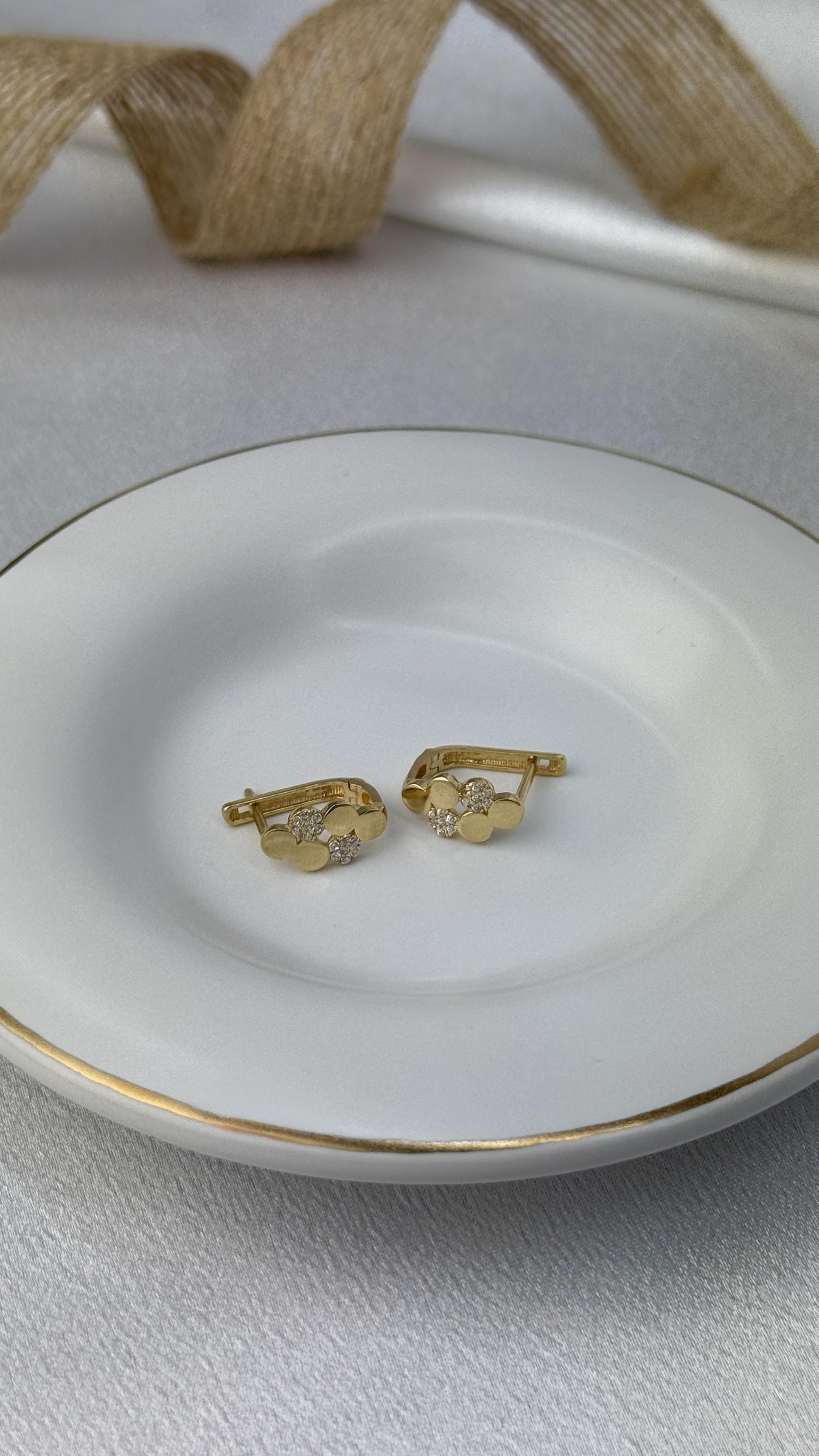 Göz alıcı taş detayları ve şık motif tasarımıyla bu altın küpe, klasik ve modern tarzı bir araya getiriyor. Günlük kullanımdan özel davetlere kadar her anınıza ışıltı katacak mükemmel bir aksesuar!