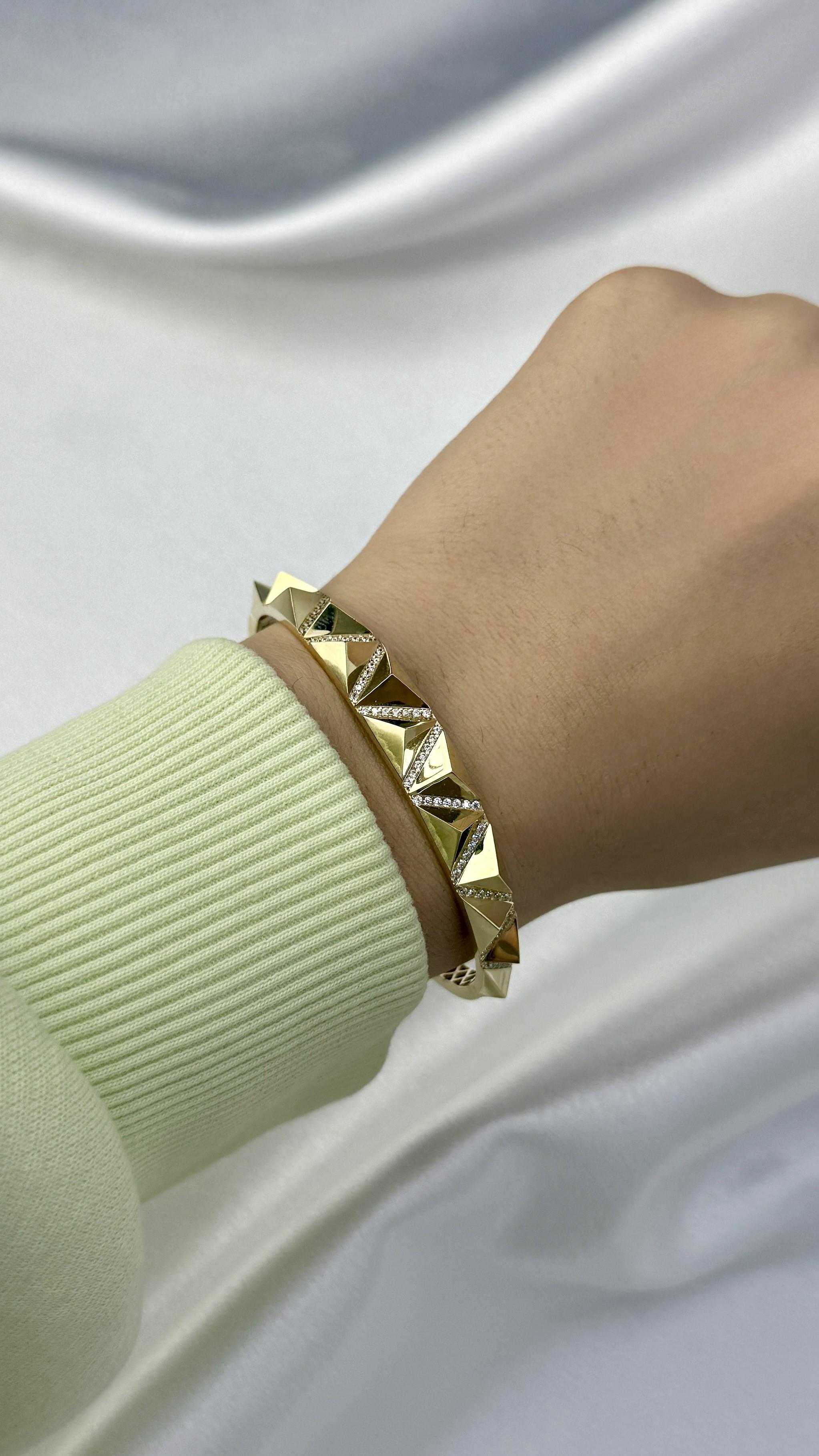 Geometrik şıklığın en zarif hali! Üçgen detayları ve ışıltılı taşlarıyla dikkat çeken bu kelepçe bilezik, 10,29 gram ağırlığında olup 14 ayar altının göz alıcı ışıltısını taşır. Modern ve sofistike tasarımıyla stilinize eşsiz bir dokunuş katıyor. 💛💎