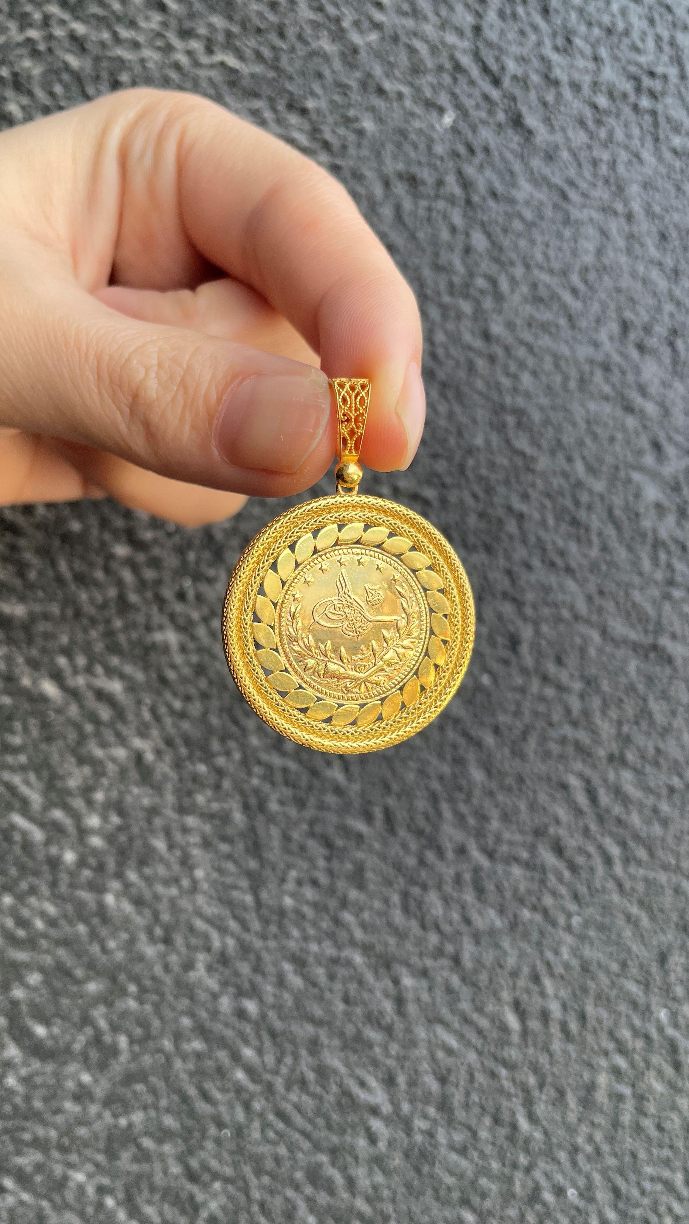 8 Ayar 4,07 Gram Tuğra Baskılı Pullu Kolye Ucu, Osmanlı tuğrası motifini zarif altın pullarla birleştirerek tarihi ve estetik bir dokunuş sunuyor. Geleneksel ve şık tasarımı, her tarza uyum sağlarken, altının ışıltısı kolyeye göz alıcı bir görünüm kazandırıyor.