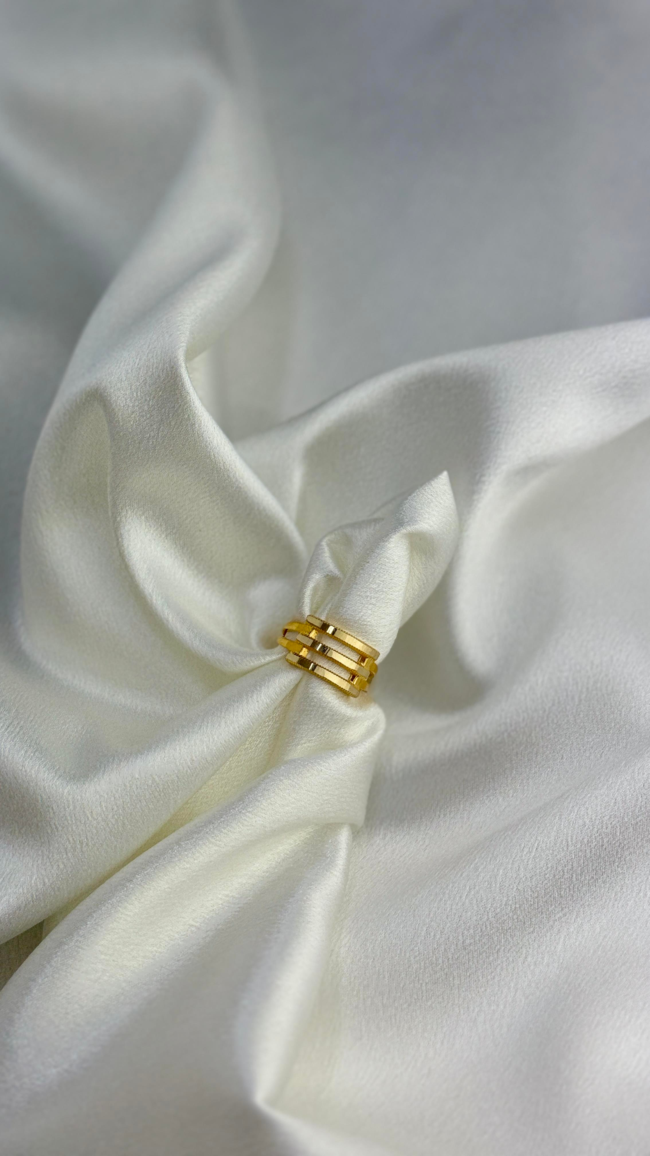 Kaburga formunun modern yorumu olan bu üç sıralı altın yüzük, sade ama etkileyici tarzıyla öne çıkıyor. Parlak yüzeyi ve özgün yapısı sayesinde hem günlük kullanımda hem de özel günlerde şıklığınızı tamamlar.