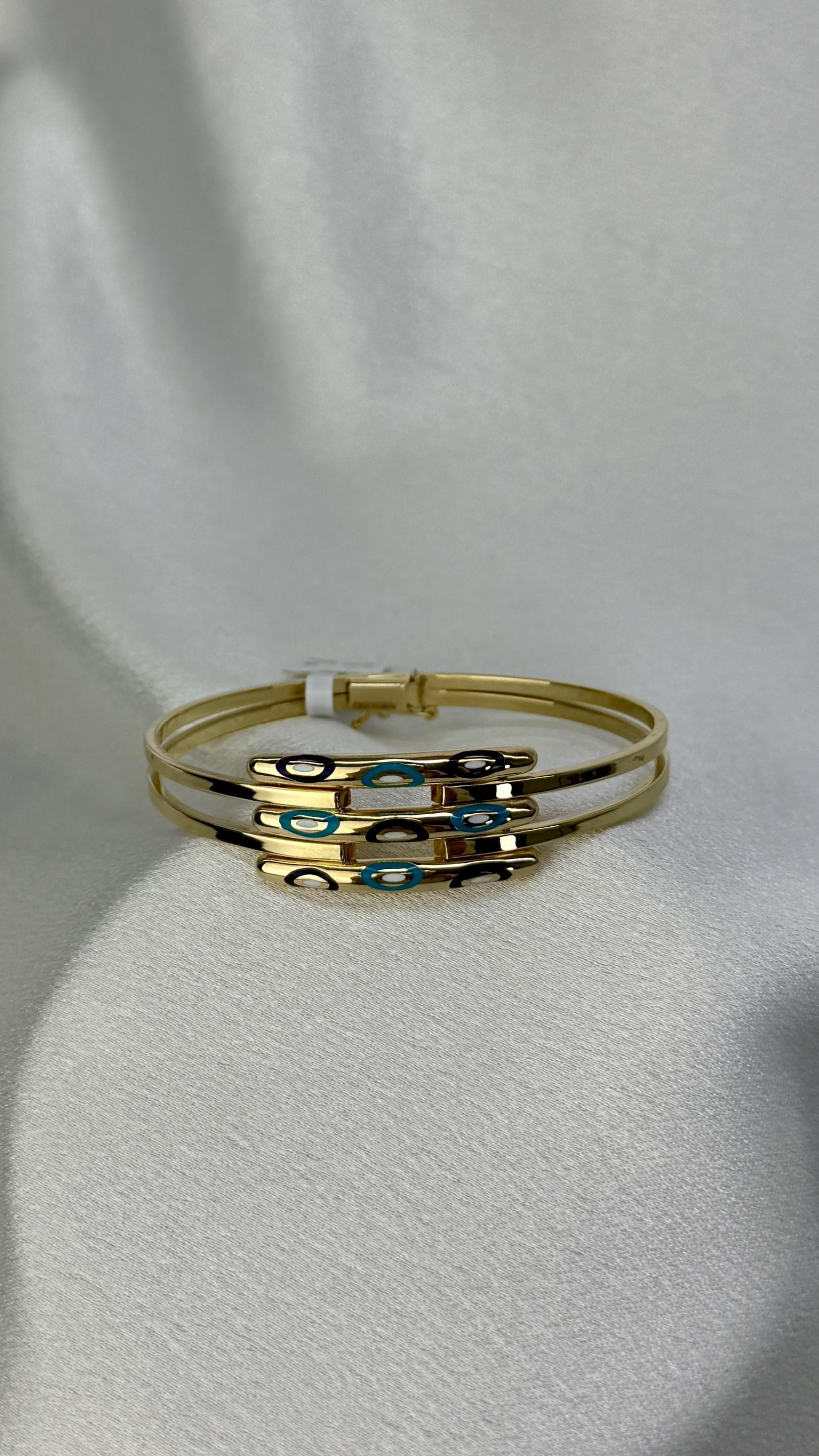 Üç sıralı zarif yapısı ve göz alıcı nazar minesiyle dikkat çeken bu özel kelepçe bilezik, sadece şık bir takı değil; aynı zamanda zarif bir sembol. 8 ayar altının sağlamlığı ve ışıltısı ile tasarlanan bu model, hem klasik hem modern tarzlara mükemmel uyum sağlar.