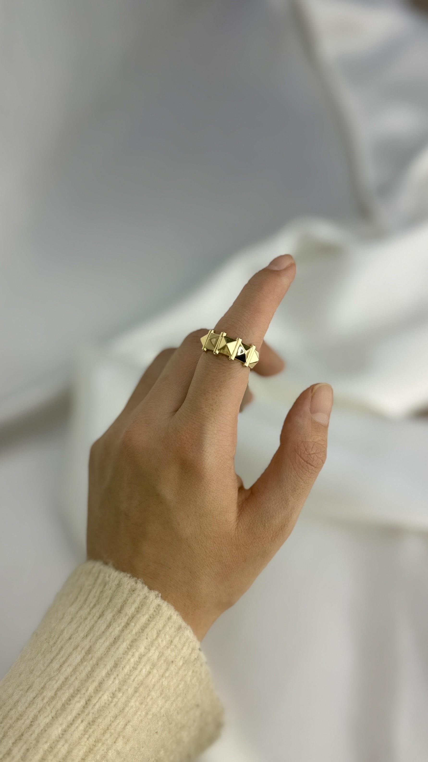 Modern dokunuşlarla tasarlanmış bu piramit formlu yüzük; sivri hatları ve üç boyutlu yapısıyla fark yaratmak isteyenler için ideal. Üzerini saran ışıltılı zirkon taşlar, her hareketinizde ışığı yansıtarak göz kamaştırıyor. Minimal ve cesur görünümüyle hem günlük hem de özel davet kombinlerinizin yıldızı olacak. 🌟